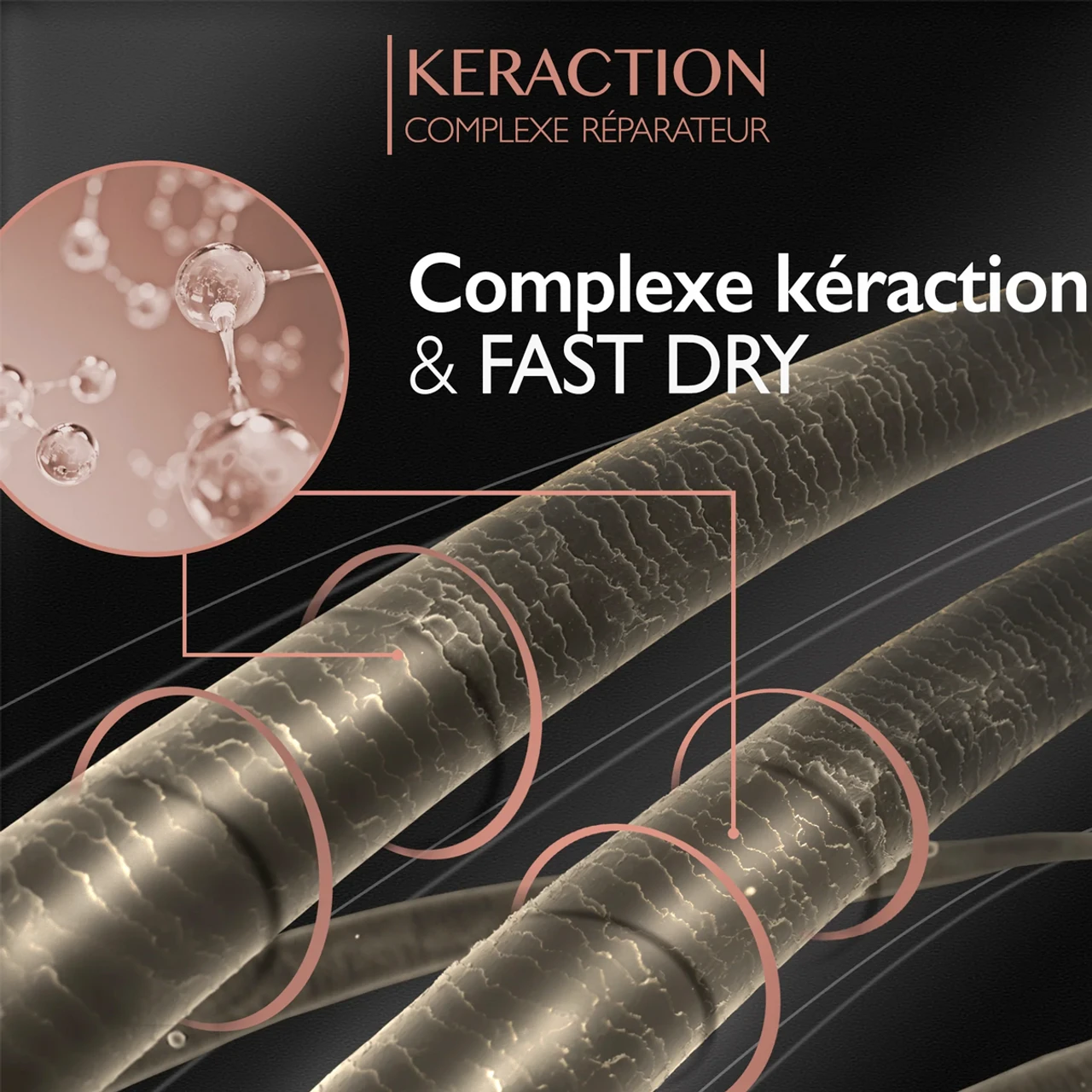 – Le complexe Keraction, une association de nutriments provenant de la Caroube et de protĂ©ines de KĂ©ratine vĂ©gĂ©tale pour prĂ©venir la casse et apporter douceur et brillance